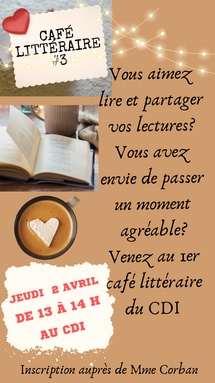 Par MARION CORBAN, publié le mardi 17 mars 2026 11:35 - Mis à jour le mardi 17 mars 2026 14:10Le prochain café littéraire se tiendra le jeudi 2 avril à 13h au CDI. Les chocolats de Pâques seront au programme. -